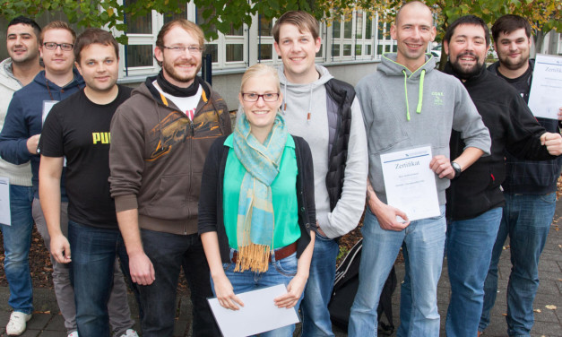 Als frisch ausgebildete Umwelt-/Energieauditoren haben unsere Absolventen eine besondere Zusatzqualifikation erworben: Sie können dafür sorgen, dass die Ökobilanz ihrer Unternehmen stimmt. Sie decken Schwachstellen in der Produktion auf, erkennen Chancen, minimieren Risiken. Hinzu kommt, dass der Gesetzgeber immer strengere Auflagen fordert – und zertifizierter Klimaschutz eng mit Auftragsvergaben zusammenhängt. Der Lehrgang am TA Bildungszentrum wird in Kooperation mit der Hochschule Ostwestfalen-Lippe durchgeführt. Daher gab’s auch gleich zwei Zertifikate für die Absolventen, die alle ihren Test mit guten Noten bestanden haben.